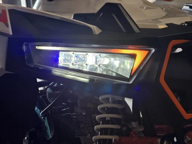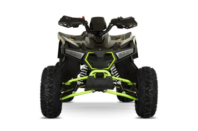 Sistemul de frânare este pe disc hidraulic (față dublu + spate), iar suspensiile (față independente cu 2 amortizoare, spate monoamortizor) asigură confort și stabilitate pe teren accidentat. Tracțiunea se realizează pe lanț.
